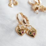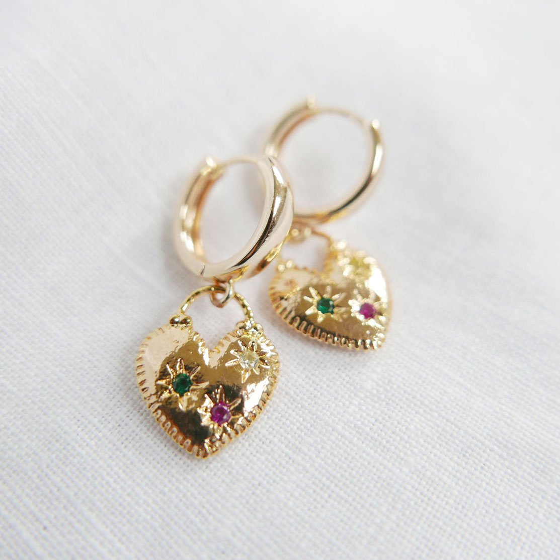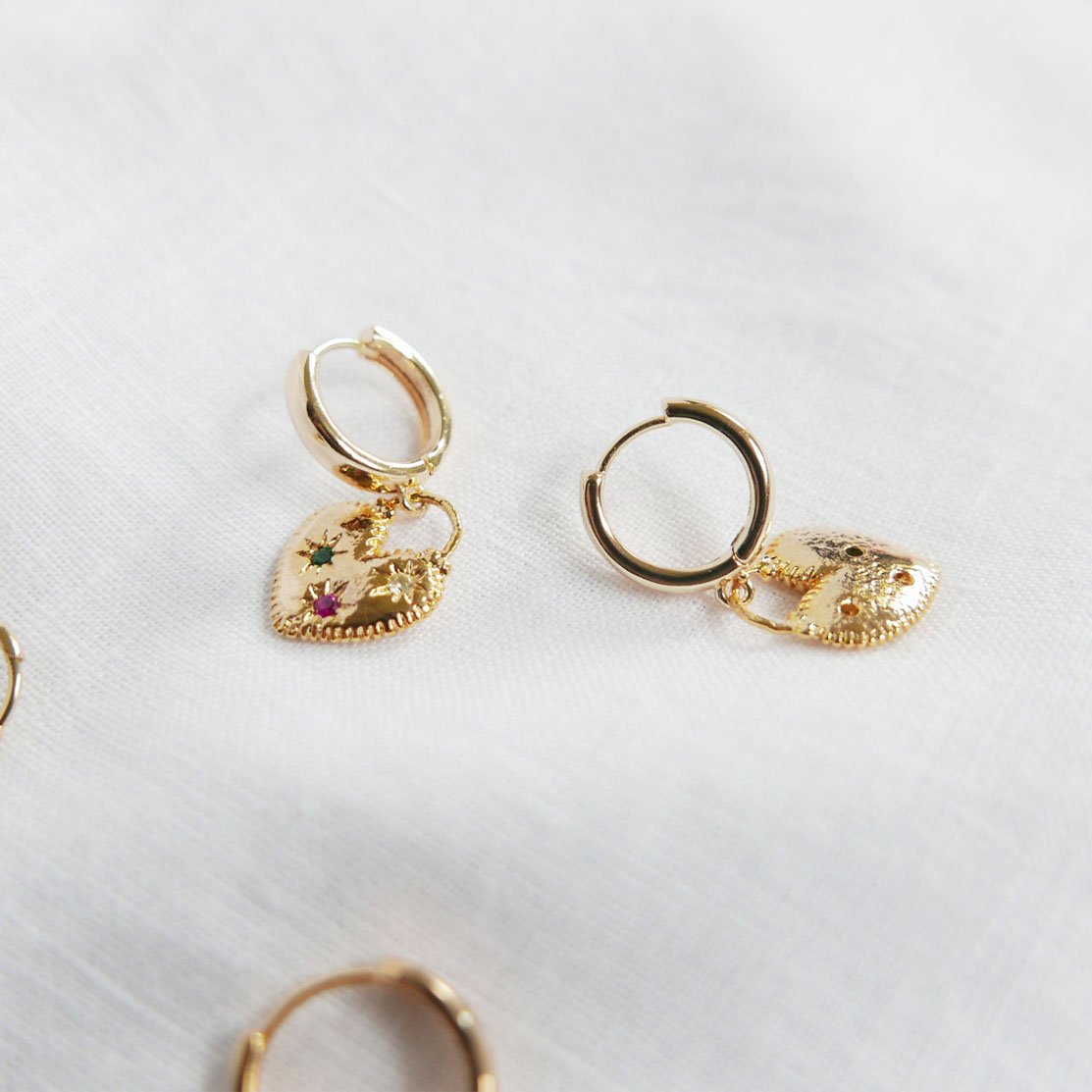 12k gold plated heart charms with zirconia gemstones on gold plated lever back hoops.
