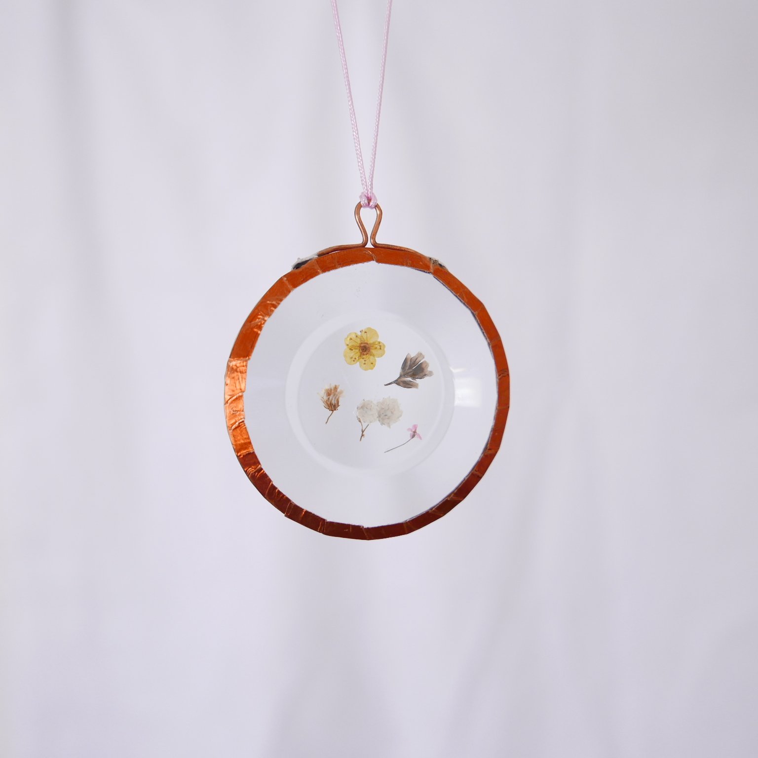 Delicate pressed flowers between glass with copper tape and hook on cotton thread.