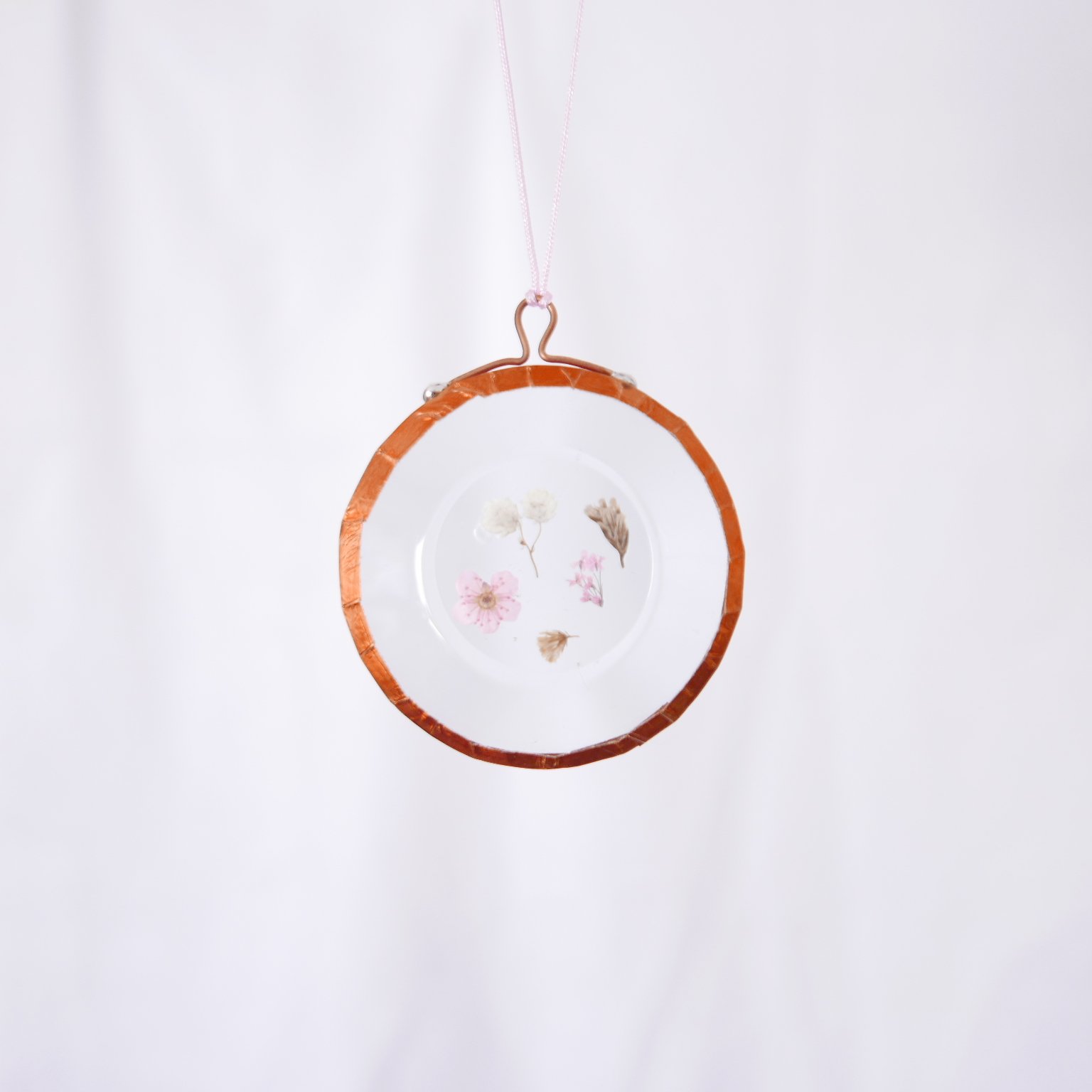 Delicate pressed flowers between glass with copper tape and hook on cotton thread.
