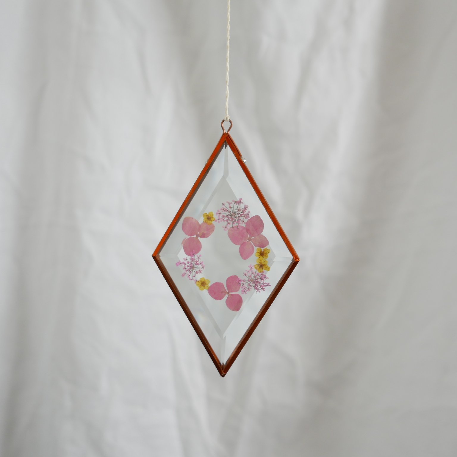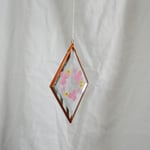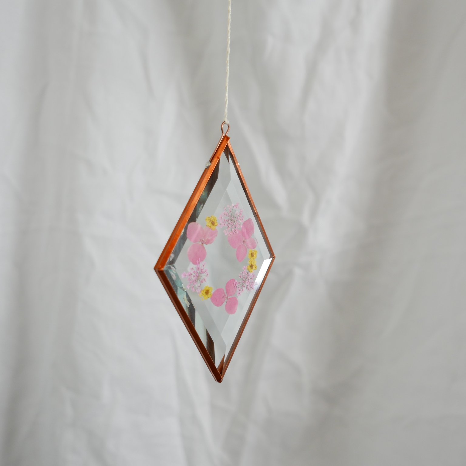 Delicate pressed flowers between glass with copper tape and hook on cotton thread.